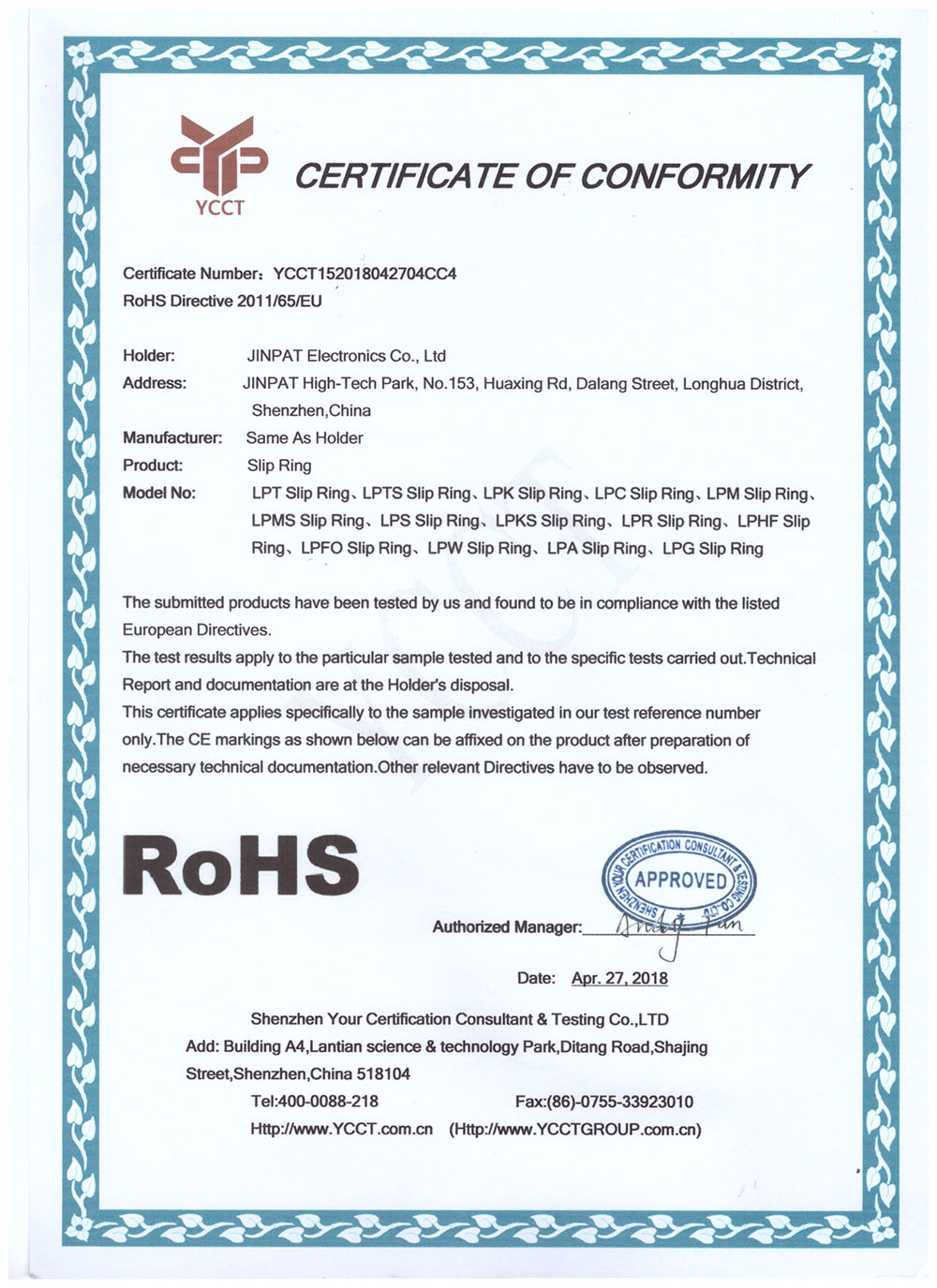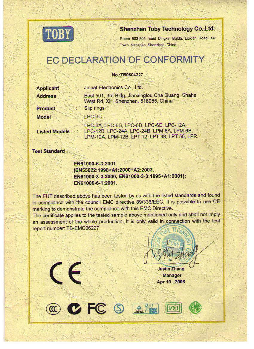 晶沛通過(guò)了歐盟CE認(rèn)證包罗万象、FCC認(rèn)證小心翼翼、SGS認(rèn)證安居乐业、BV“船級(jí)社”認(rèn)證、防爆認(rèn)證等多項(xiàng)認(rèn)證,生產(chǎn)的導(dǎo)電滑環(huán)都符合RoHS環(huán)保要求,先后被授予“國(guó)家高新技術(shù)企業(yè)”稱(chēng)號(hào),目前已獲得45項(xiàng)專(zhuān)利,其中發(fā)明專(zhuān)利6項(xiàng)。